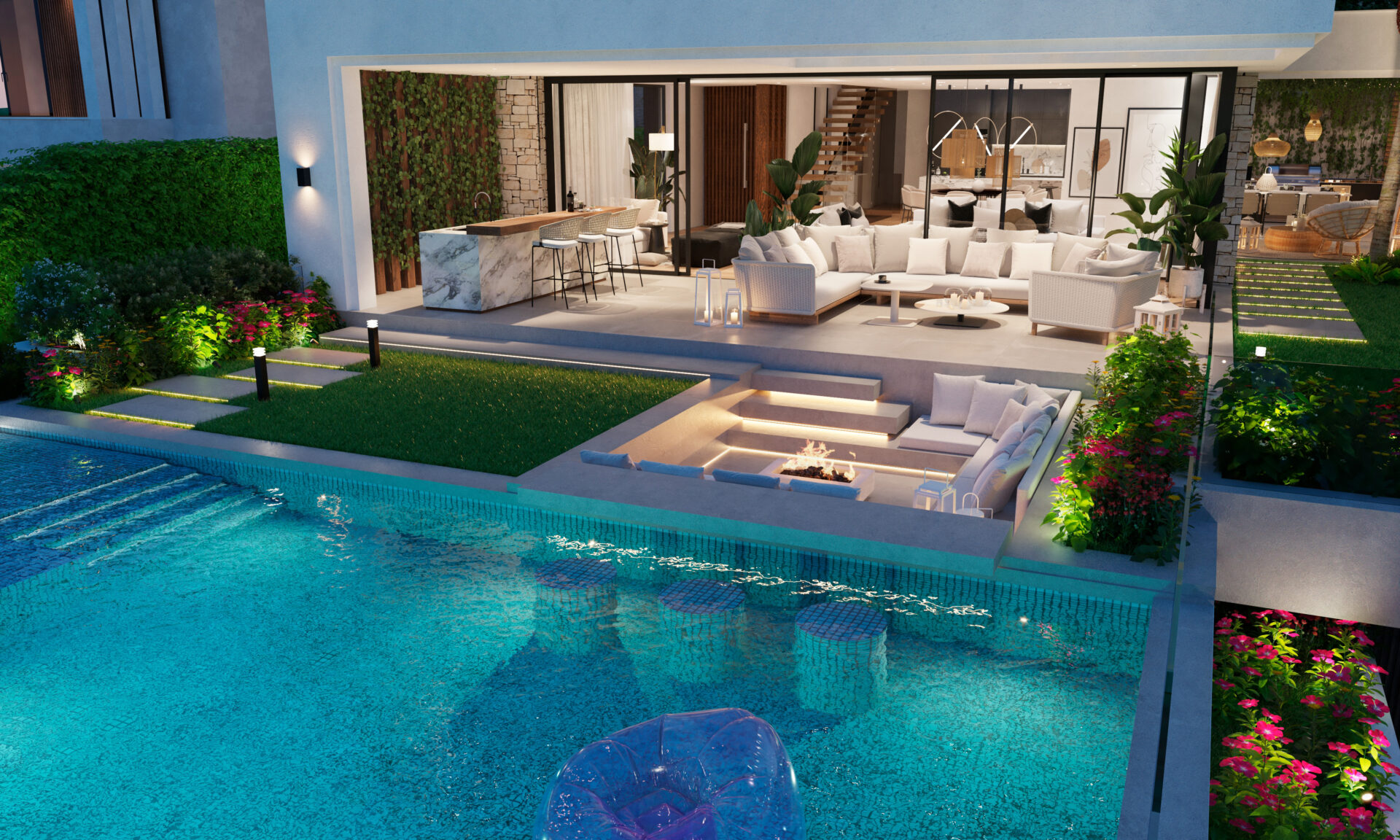 Enjoy the outdoors with large covered private terraces and gardens, an impressive outdoor kitchen, a relaxing chill-out area, and a cozy fire pit next to the infinity pool with 180° views over the Mediterranean Sea.